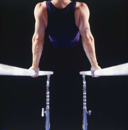 Male gymnast on parallel bars, rear view